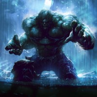 a muscular build and green skin, sitting in an intense pose that suggests he is ready for action or combat. The background features a dark and moody ambiance with rain-like effects, enhancing