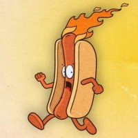 dog character with a flame on top of it, suggesting that the character is on fire. This could be part of a comic or graphic design related to food, particularly