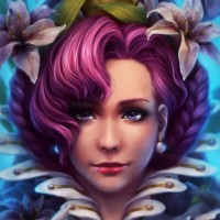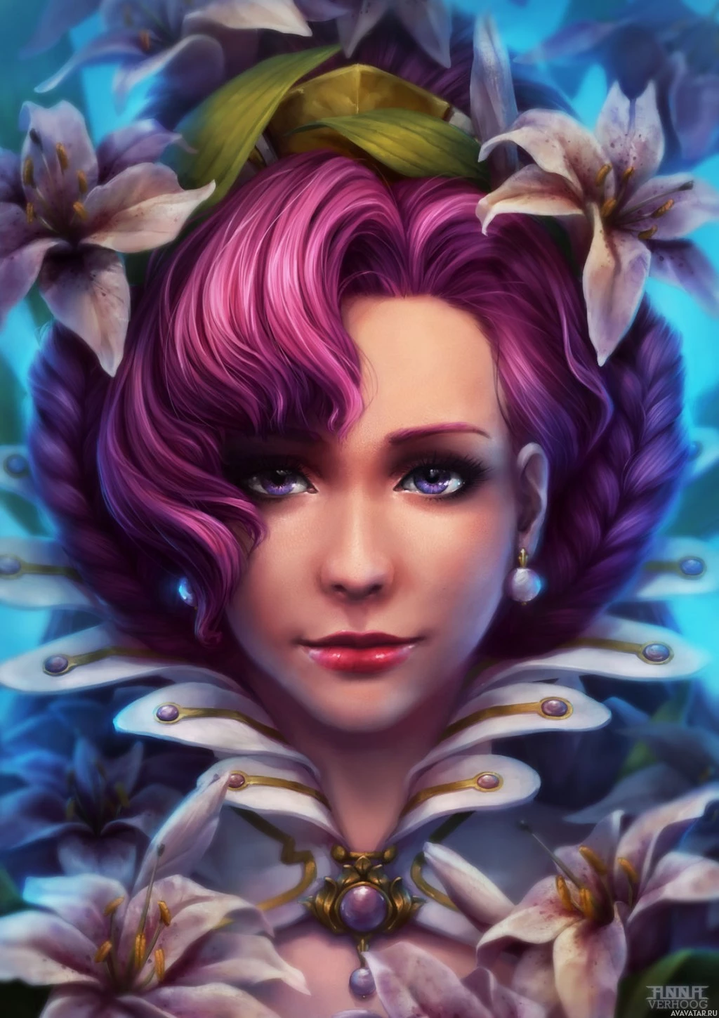 purple hair, wearing what appears to be a fantasy or fairy-tale inspired crown or headpiece. She has makeup that accentuates her eyes and lips, giving her a regal and whimsical appearance. Surrounding her is an assortment of flowers, including lilies, adding to