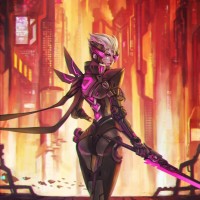 a dynamic pose with a confident expression, holding what looks like a weapon or a tool that complements her fighting style. The background suggests an industrial or technologically advanced setting, which aligns with the fantasy sci-fi elements present in League of Legends.