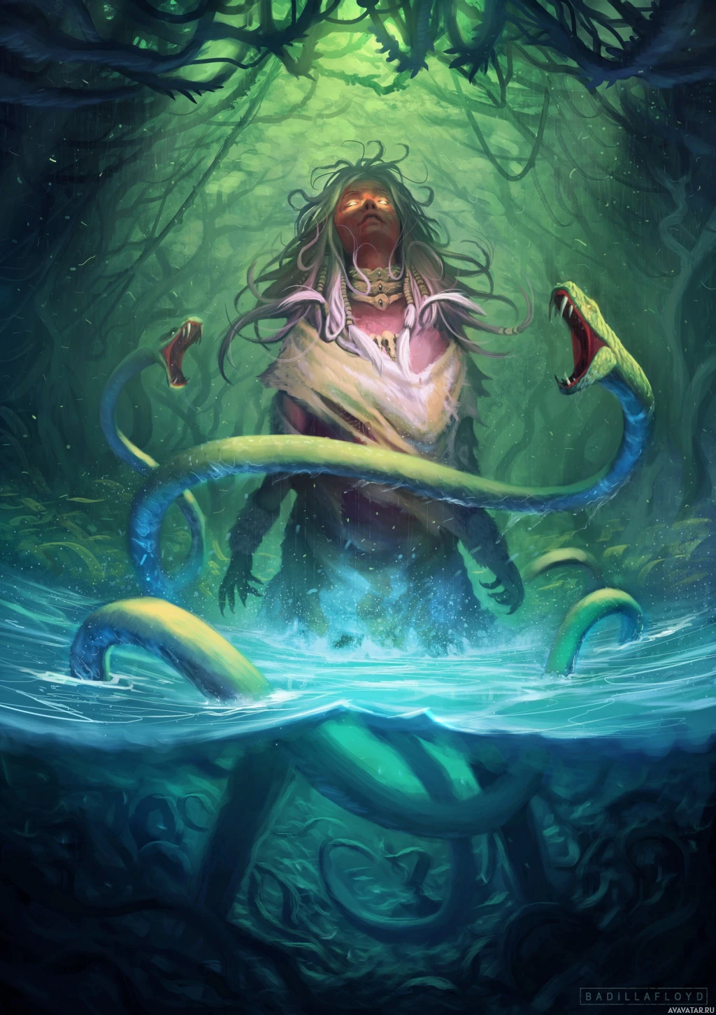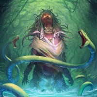 several snakes. The background features an enchanting forest setting with twisted trees that give off