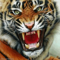 face of the animal with its mouth open and teeth visible, conveying a sense of roaring or growling. The fur is detailed, capturing the distinctive orange and