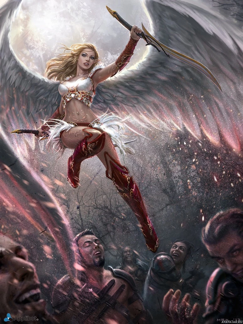 a fantasy scene featuring an angelic figure. She is depicted with wings and has