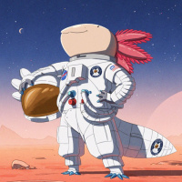 filled sky with planets visible, including a prominent depiction of Earth and the Moon in the distance. The art style is reminiscent of comic book illustrations, with vibrant colors and a playful, whimsical