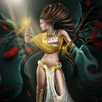 a magical staff or wand in her hand, contributing to the fantasy theme of the artwork. The overall style is highly detailed and suggests a storytelling purpose, possibly representing a character from a video game, book series, or an original mythological narrative.