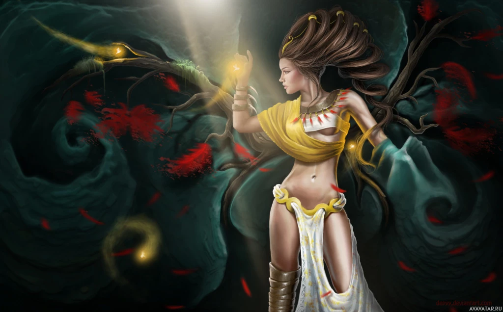 use of lighting and shadows adds depth to the composition, emphasizing her form and the intensity of her expression. There are also elements such as leaves and what appears to be