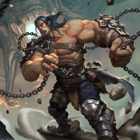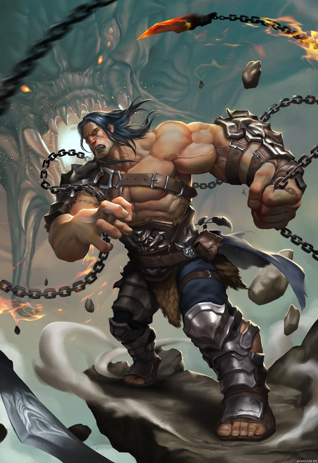 a fantasy scene with a muscular man in the foreground. He is wearing armor and appears to be holding