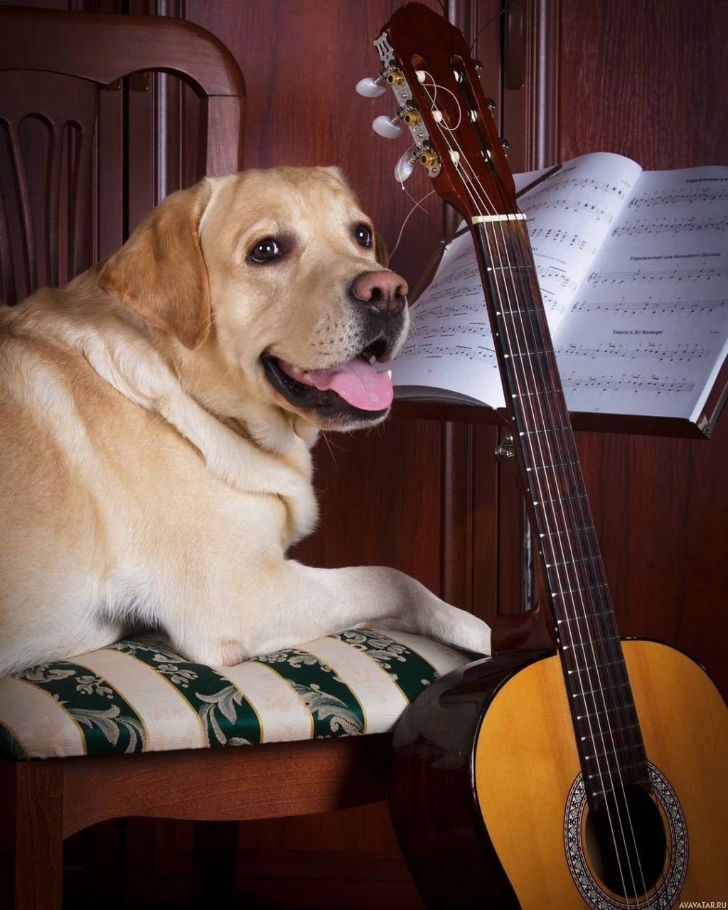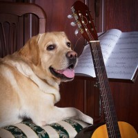 music book and a guitar. The dog appears to be attentively looking towards something off-camera, possibly indicating it has been trained or is familiar with the process of playing