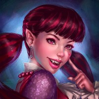 pointed ears resembling those of a fantasy or vampire character. The background is dark, suggesting