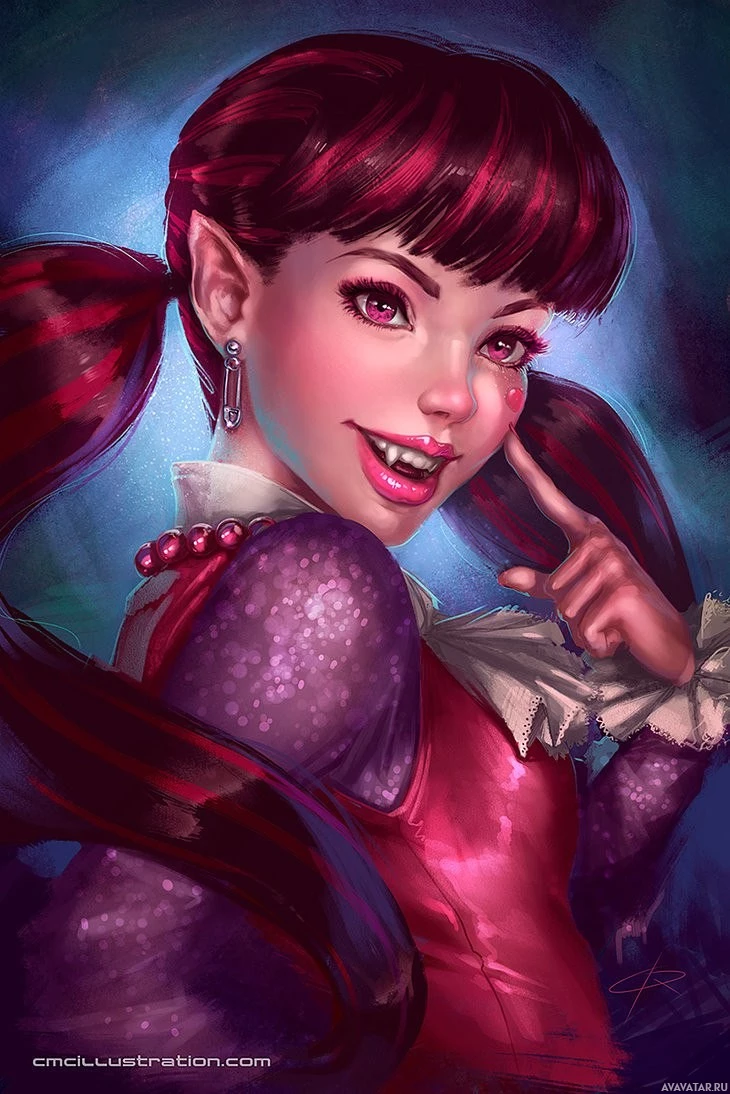red hair styled into two ponytails, wearing a red dress and pearl earrings. She has elongated