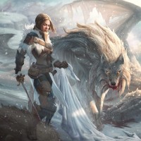 The image depicts a fantasy scene with a girl wearing armor and carrying a sword. She is standing on snow-covered ground, and there is a wolf at her side. The girl appears to be gazing off into the distance, possibly looking at another creature or location beyond the frame of the picture. The overall atmosphere suggests an adventurous or epic narrative in this fantasy setting.