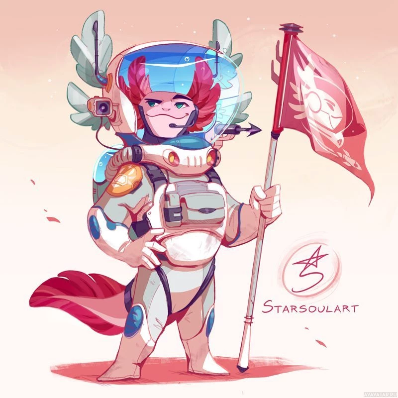 The image features a character that resembles an astronaut, wearing a spacesuit with the helmet up. This character is also adorned with accessories and markings that resemble those of an axolotl, which is a type of salamander known for its ability to regenerate limbs. The character holds what appears to be a flag in one hand and a trident-like weapon or tool in the other. The background is simple with