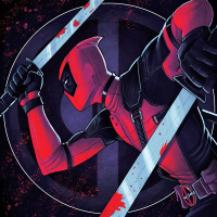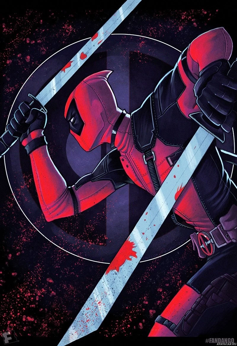 the iconic symbol of Deadpool's alter ego, Wade Wilson, which consists of a skull and swords crossed over it. The overall style of the image is consistent with comic book artwork.