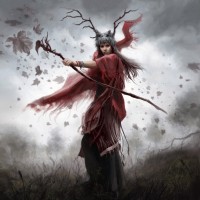 a female warrior or archer, standing amidst what looks like a stormy, autumnal setting. She is dressed in traditional clothing with elements of