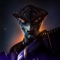 a humanoid form but has distinctive traits such as a prominent headpiece, pointed ears, and an unusual facial structure. The artwork captures the sci-fi essence of "Mass Effect" by portraying the alien in