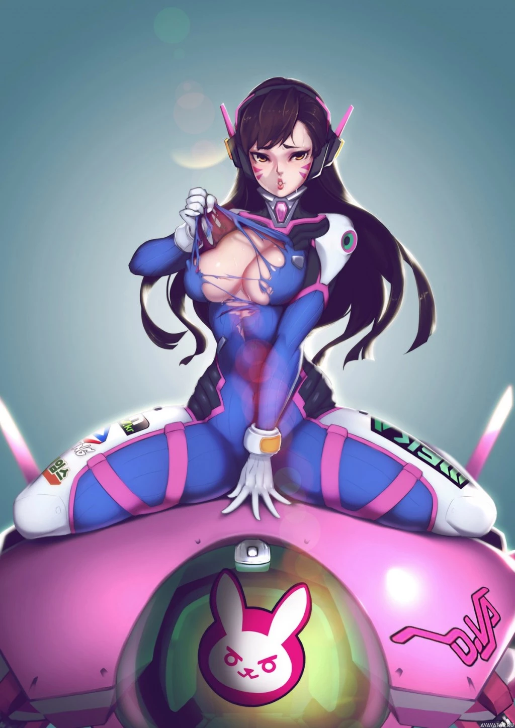brown hair and is holding what appears to be a gun in her right hand. In the background, there's a robotic mech or support drone with a face, commonly associated with D.Va's character design. The overall image captures the dynamic and futuristic aesthetic of Overwatch, showcasing the character's role as