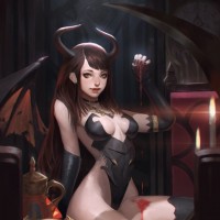 an illustrated character that appears to be a fantasy representation of a succubus. She is depicted with demonic features, such as horns and pointed ears, along with wings, which are common characteristics for