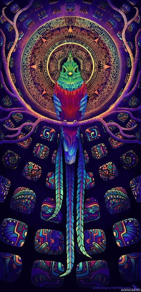 the center of the composition is an intricate mandala, which includes various symbols and patterns within concentric circles that radiate outward from a central point. Surrounding this mandala is a figure that appears to be a human-like creature, blending elements of a bird with human limbs, standing in