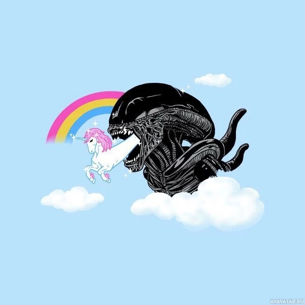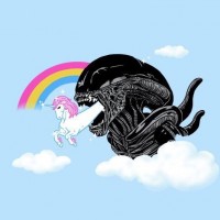 traditional symbols associated with fantasy and magic. The alien appears to be interacting with the unicorn by blowing smoke or perhaps some form of attack towards it. This juxtaposition of a horror-themed creature with a typically innocent symbol creates a humorous and surreal effect, blending elements of