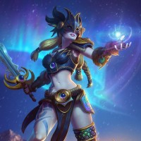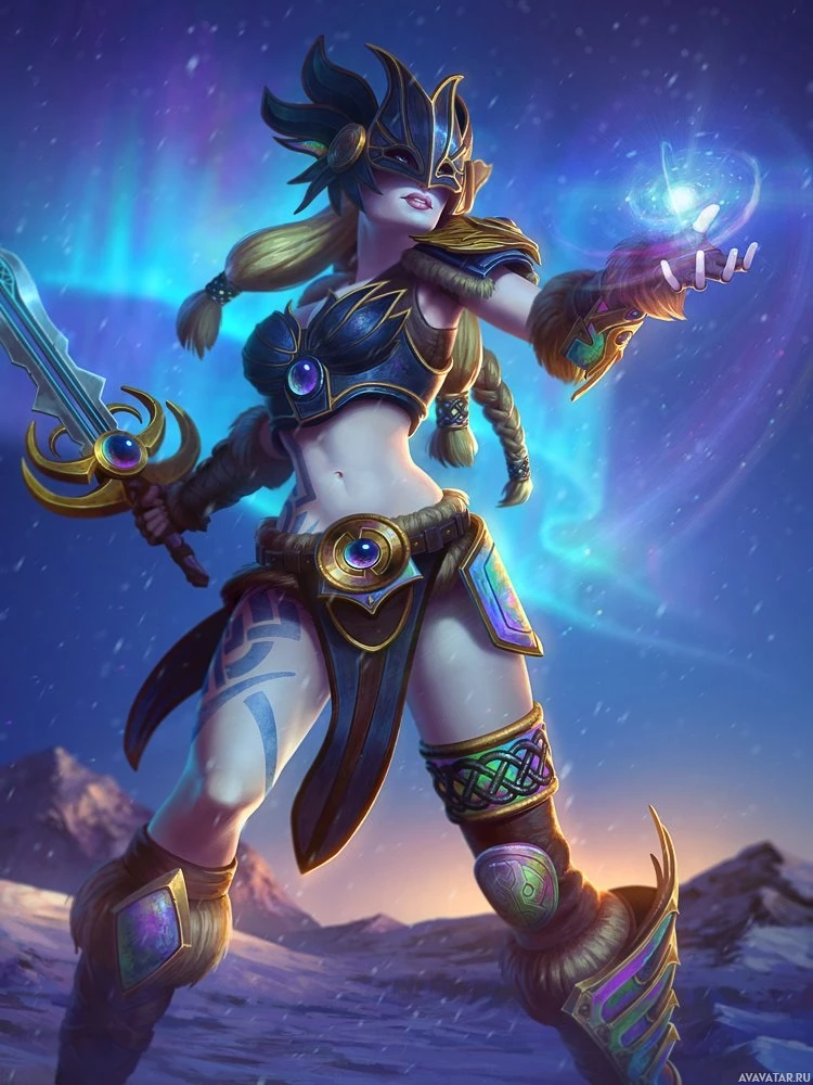 На снимке показан женский персонаж из видеоигры «Лига легенд». Она изображена в фантастической обстановке, одета в доспехи и держит меч. Ее одежда предполагает, что она может быть воином или героем во вселенной игры. Художественное произведение яркое с красочными элементами фона, которые способствуют магическому и эпическому ощущению дизайна персонажа.