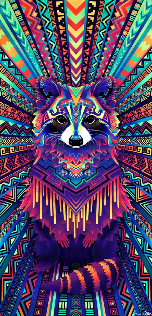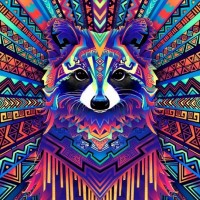 intricate patterns and designs, possibly inspired by tribal or psychedelic art styles. The raccoon itself is illustrated with its distinctive stripes and mask-like