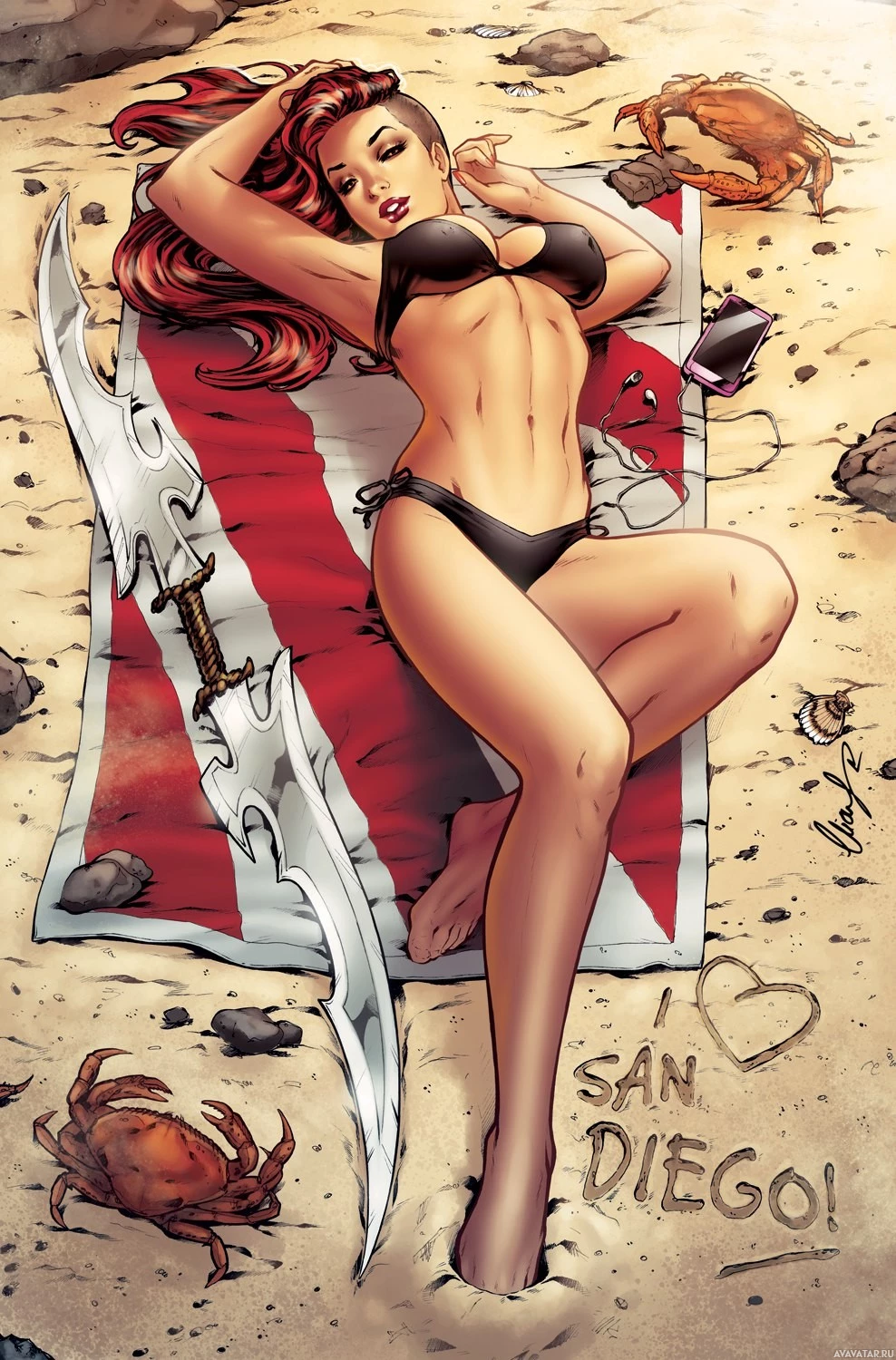 a female character in a bikini, lounging on the beach with red hair and holding a sword. She is lying down on a towel that has "