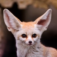 red fox with large, perked-up ears, which is characteristic of the species. Its eyes and nose are visible, and it appears to be looking directly at the camera with