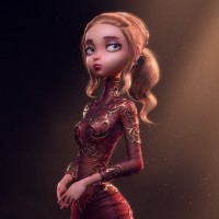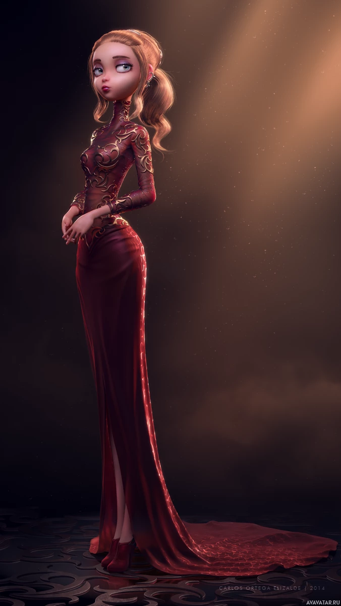 a red dress that appears to be made of a shiny, reflective material. Her expression is neutral, and she seems to be standing in a room with dim lighting, which gives off