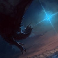 a large creature in the center, which appears to be a dragon, surrounded by dark and ominous clouds. The background shows a landscape that resembles a volcanic or mountainous area with erupting lava and what seems to be