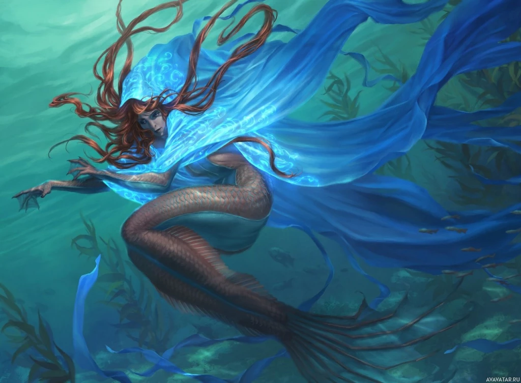На картинке изображена русалка с рыжими волосами. Она находится под водой, в окружении водных растений и морских существ. Ее тело, кажется, смешивается с окружающей средой, предполагая, что она является частью экосистемы океана. Картина демонстрирует чувство спокойствия и очарование моря.