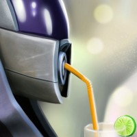 iconic armor with a helmet that covers her face. In her hand, she is holding a drink that includes a straw and what looks like a slice of lime floating on top, suggesting it might be