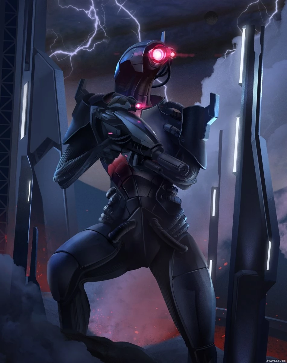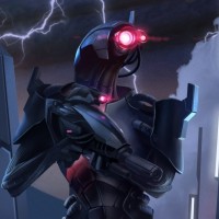an artificial intelligence or synthetic entity, given the design and color scheme. The background features