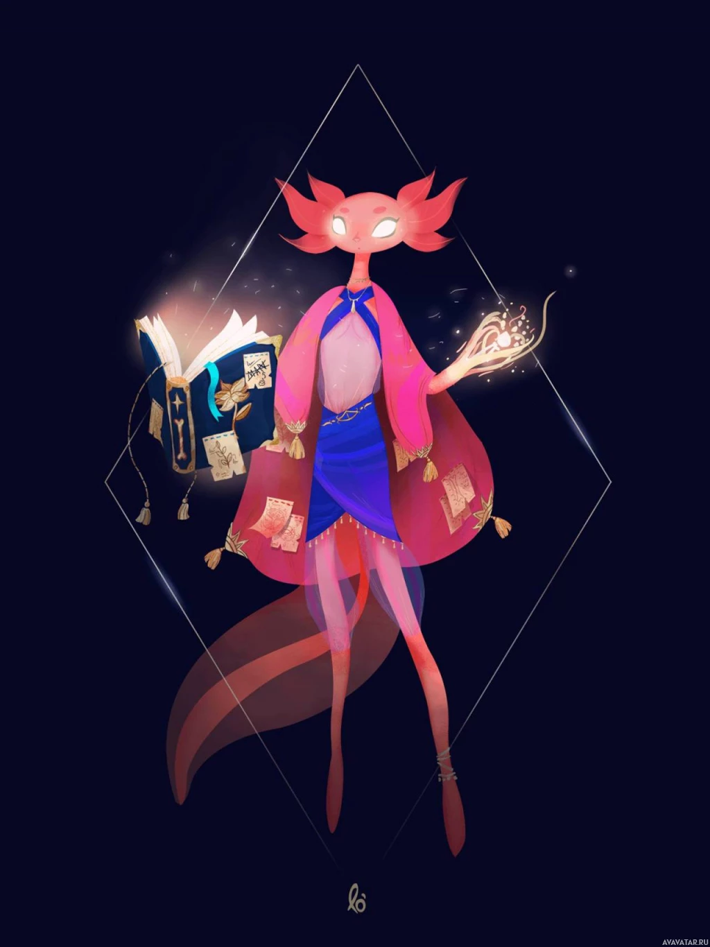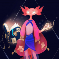 the bright colors of the character's attire and the glowing effects around the book and wand, giving the impression that the character might be performing a spell or ritual. The style is reminiscent of anime or manga artwork.