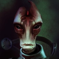 facial structures, but the distinctive Asari pointed ears can be seen on either side of her head.