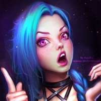 a black outfit with a cross-like design on it, suggesting a dark or edgy style often associated with characters like Jinx. The background has a nebulous