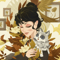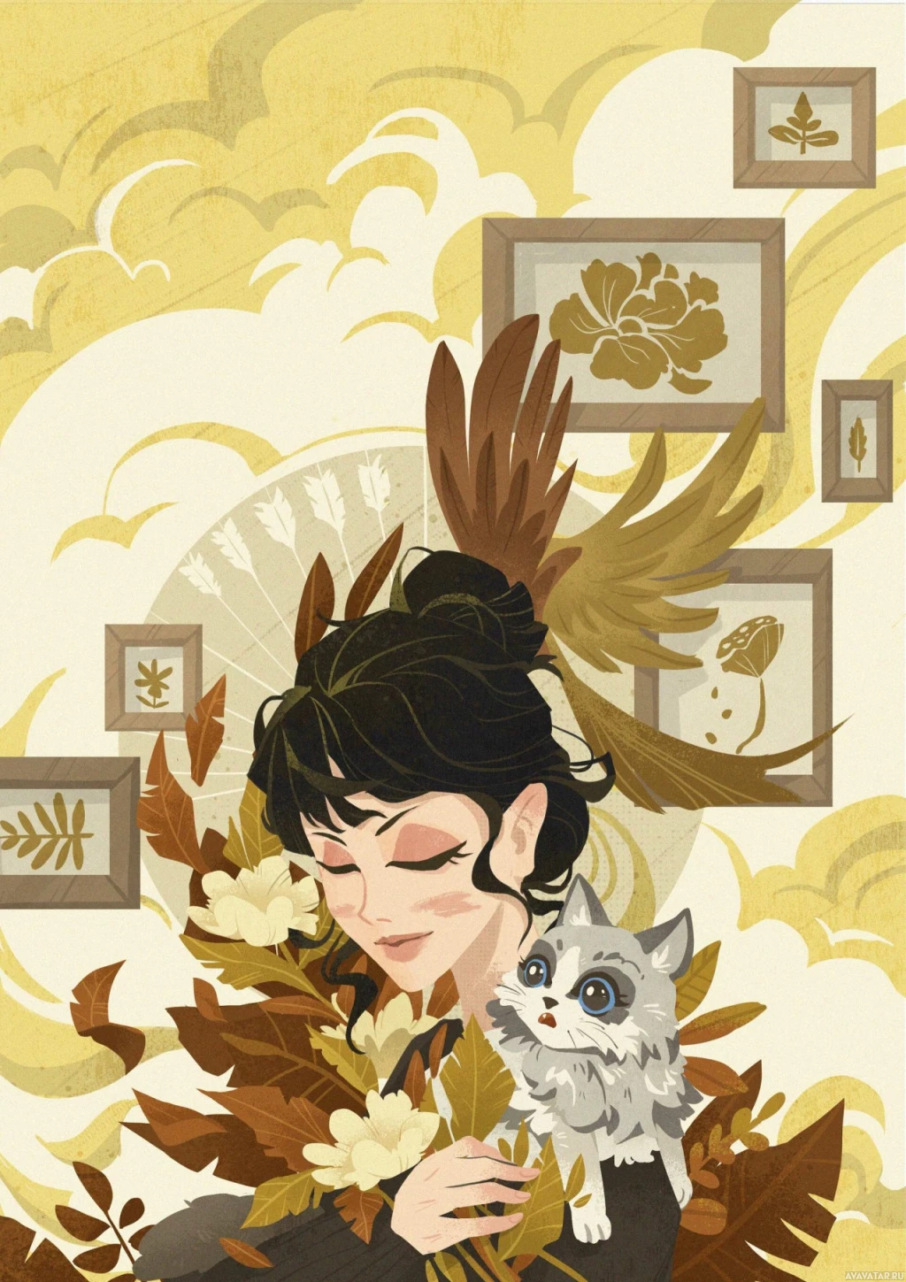 a small cat in her arms, which appears to be content and relaxed. The background consists of autumnal leaves and decorations that give the scene a seasonal and