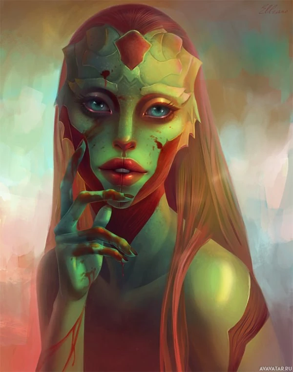 a humanoid form with skin and hair resembling human features but also displays some alien traits such as elongated eyes and pointed ears, which are characteristic of certain species in the game's universe, like the Asari or Turian races. The character is adorned with