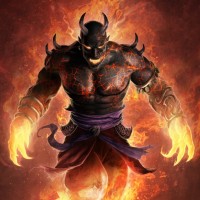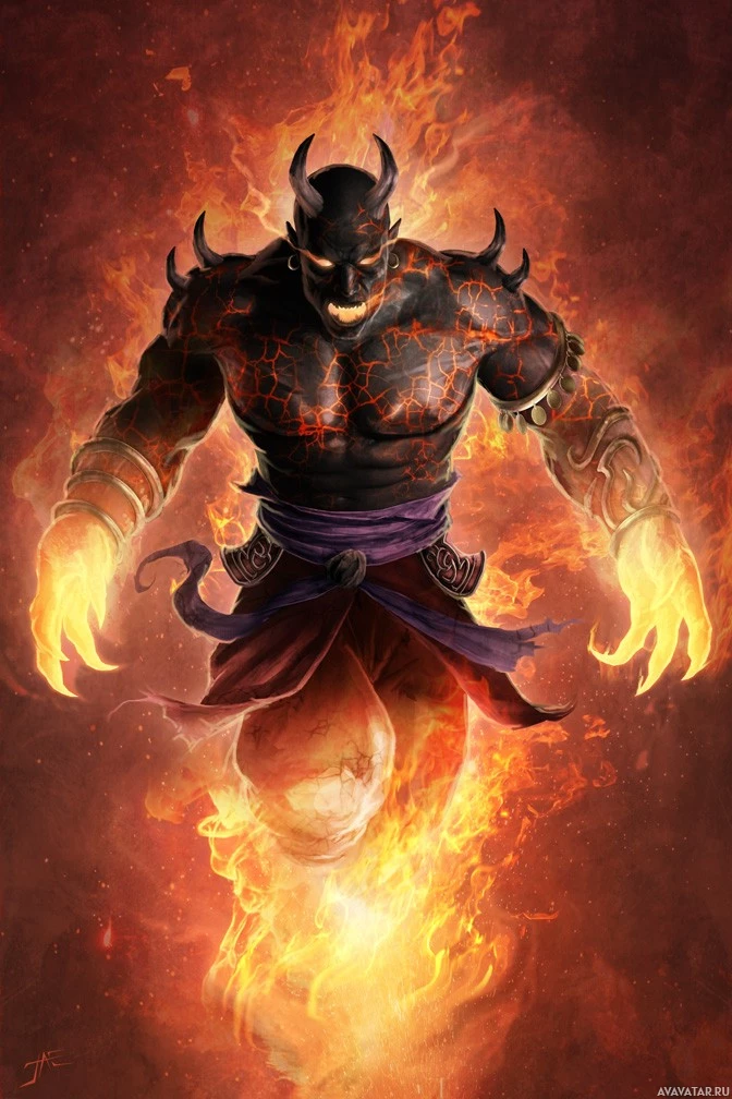 The image depicts a fantasy-themed character that appears to be a demon. This creature is anthropomorphic with human-like features but has prominent horns and fiery energy emanating from its hands, which gives it