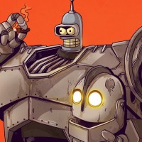 a robot character known as Bender, who has a mechanical endoskeleton and is programmed for destruction. He is holding a cigar in one hand while pointing with his other hand towards a smaller robot that resembles himself but is significantly less armored and more human-like in appearance. This robot appears to be in a state of distress or concern, given its wide eyes and