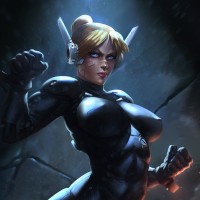 blonde hair styled into buns. Her expression appears focused or intense. The setting appears to be a dark, possibly underground environment, which could imply a scene from a comic book or video
