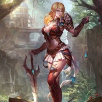 a dynamic pose, standing on what looks like a rocky outcrop with her sword drawn, ready for battle. The character is wearing armor and carrying a shield, suggesting she is prepared for combat. The background features a lush green environment with trees and rocks, contributing to