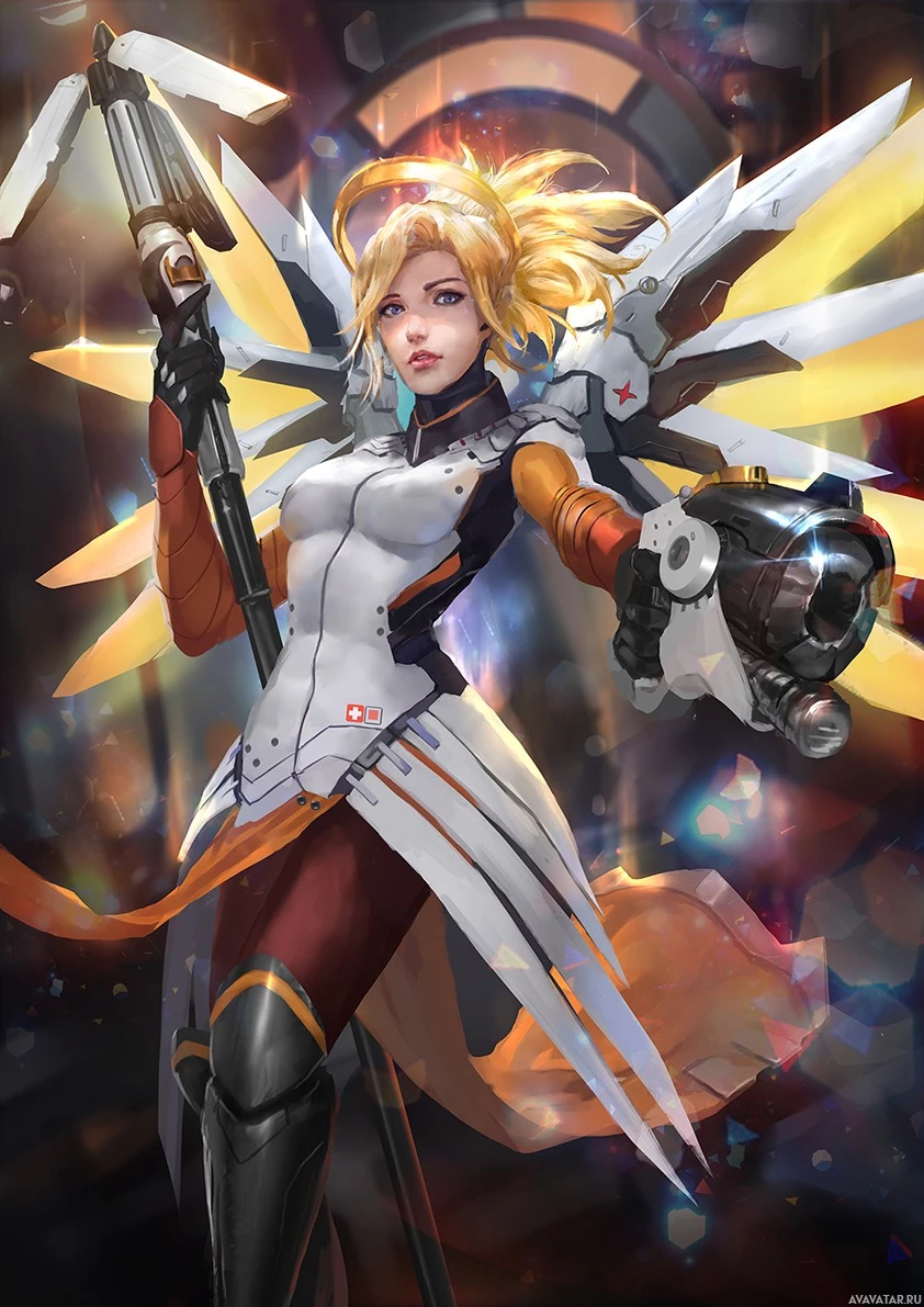 a female character from the video game "Overwatch." She is styled as Mercy, one of