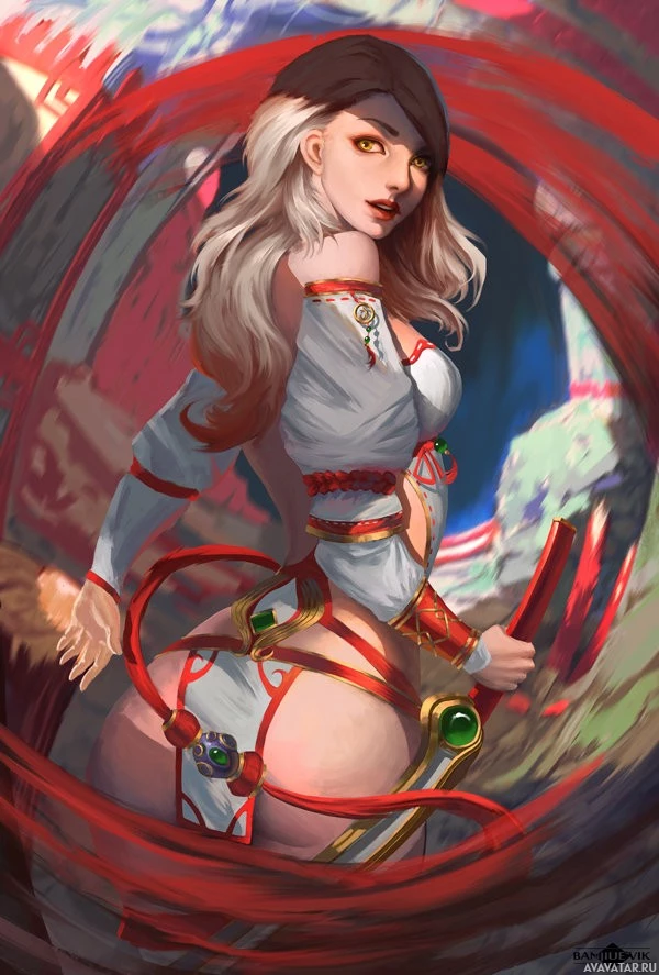 blonde hair and is wearing a white outfit with red accents, featuring a design that seems inspired by armor. She holds what looks like a sword in her left hand and is standing in