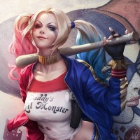 a baseball bat that has been transformed into a mallet by wrapping a gold band around its middle. The background features graffiti-style artwork with the name "HARLEY QUINN" prominently displayed, reinforcing her identity as the character. Her expression is confident, and she appears to be looking directly at the viewer.
