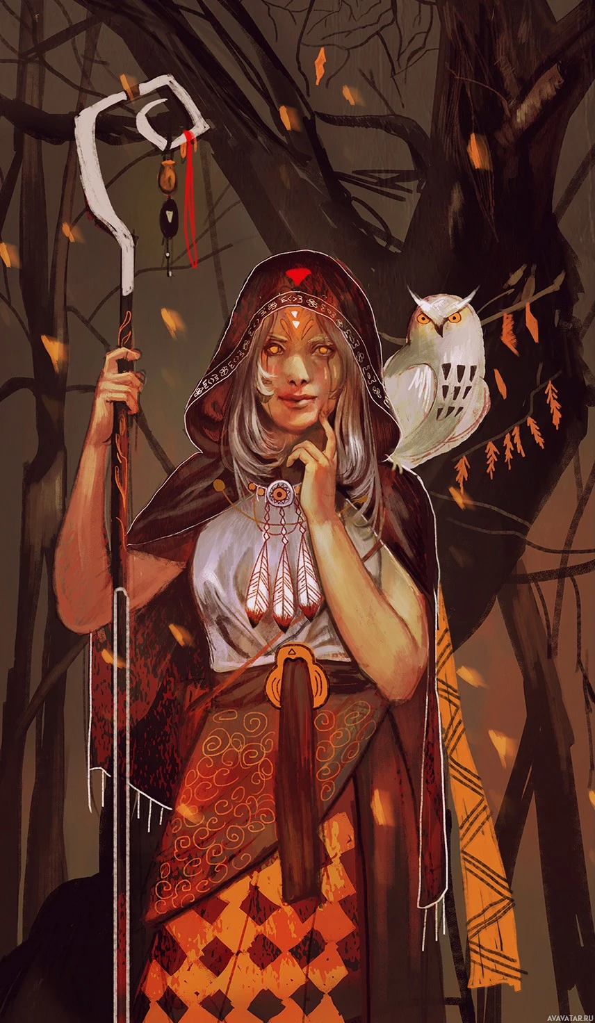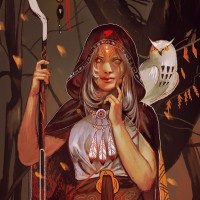 a young woman dressed in what seems to be traditional or fantasy attire, possibly inspired by medieval or folklore styles. She is wearing a hood and has an owl perched on her shoulder, which might suggest she is a witch or has some kind of