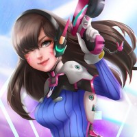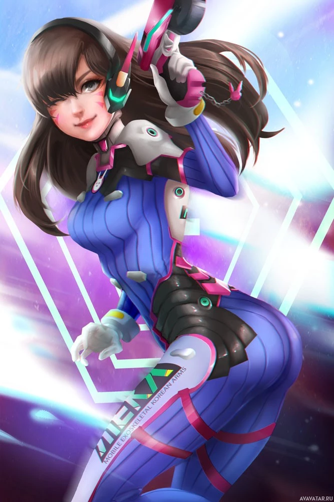 На картинке изображен анимированный персонаж, который выглядит как D.Va из видеоигры Overwatch. Она изображена в своем культовом синем костюме с белым шлемом, держа пистолет обеими руками, и у нее широкая улыбка на лице. Фон предполагает футуристическую или космическую обстановку с красочным взрывом энергии вокруг нее.
