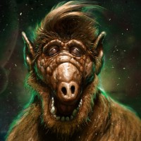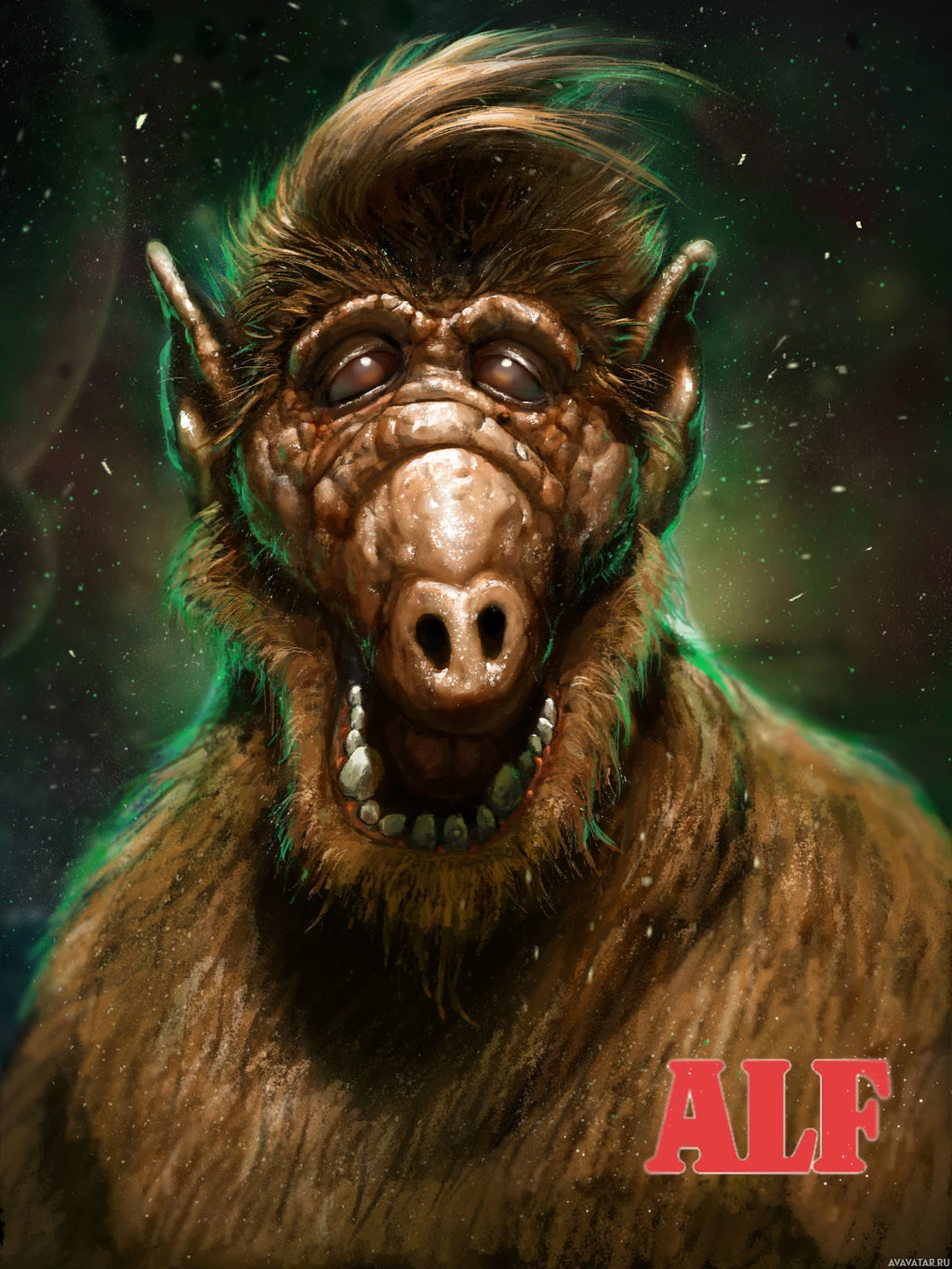 a fantastical character that resembles Alf, a well-known anthropomorphic alien from the 1980s television series of the same name. This character is portrayed with exaggerated features such as