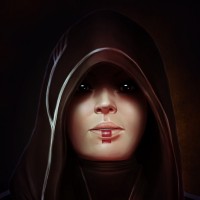 space exploration and conflicts between different species and factions. The artwork captures the character's distinctive appearance, including the hood and possibly armor-like clothing, which are common elements in the "