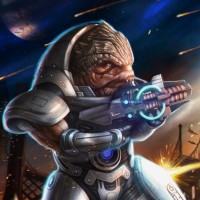 battle scene with explosions and debris flying around, indicating action or conflict. This image captures the sci-fi and action elements of the Mass
