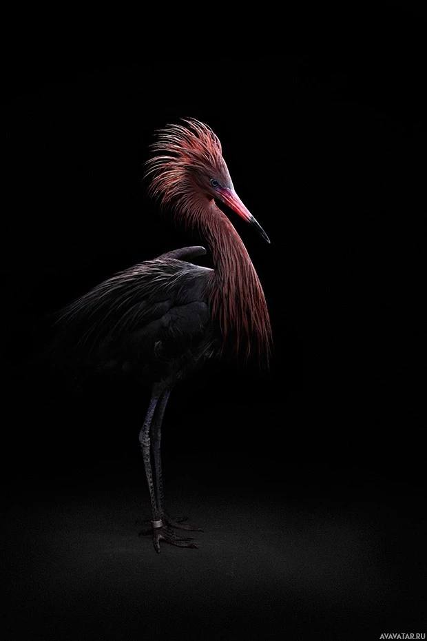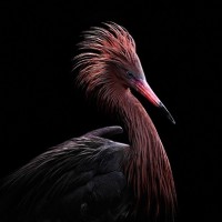 red plumage, which appears to be an egret or similar wading bird. It stands against a dark background that contrasts sharply with the bird's